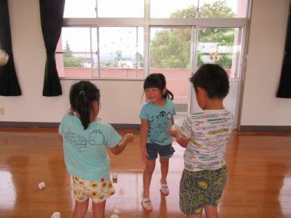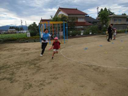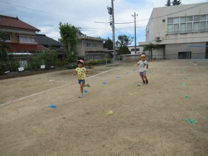 園庭に出て、かけっこをしながら走り方を振り返った後、先生も入ってリレーをしました。最初は子供たち対先生。勝てると思っていたのに子供たちに僅差で負け、2回目は快勝しました。子供たちは負けたことを悔しがり、どうしたら速く走れるのか考えていました。午後からは玉入れ。今まで一度も玉を入れたことのない友達が泣いていると「どうしたら入れられるかな」「こうしてみたらどう」と意見を出し合って練習を見守り、玉が入ると拍手で喜び合っていました。