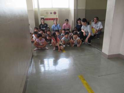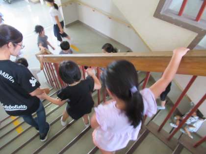 地震から洪水が発生し、月岡小学校3階への避難指示が出た想定で、園児・職員全員で避難しました。小学校のお兄さん、お姉さんも真剣に避難する中、いつもと違う雰囲気に子供たちも緊張した表情で参加していました。