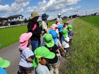久しぶりに秋晴れの良い天気になりました。歩いていると暑くて汗だくになるくらいでしたが、道端でエノコロ草を摘んだり、バッタやトンボを見付けたりしました。畑では枝豆やなすび、トマト等知っている野菜を見付けて「私たちも育てたよね」「家でも植えてるよ」と話していました。ひょうたんやへちま等、珍しい植物も見付けて、その形や大きさに驚いていました。