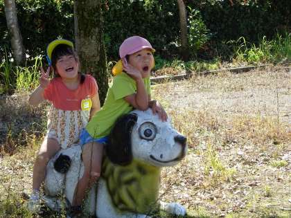久しぶりに秋晴れの良い天気になりました。歩いていると暑くて汗だくになるくらいでしたが、道端でエノコロ草を摘んだり、バッタやトンボを見付けたりしました。畑では枝豆やなすび、トマト等知っている野菜を見付けて「私たちも育てたよね」「家でも植えてるよ」と話していました。ひょうたんやへちま等、珍しい植物も見付けて、その形や大きさに驚いていました。