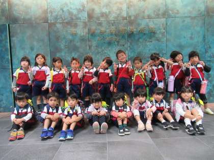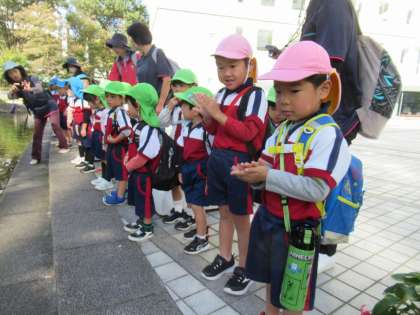 少し早く到着したので、富山市役所にある池へ鯉を見に行きました。黒い鯉の中に赤や白、模様の入った鯉を見付けて喜んでいました。