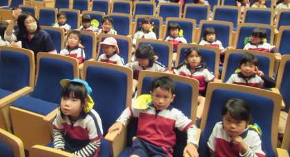 シルエット観劇では「花さき山」と「つのぶえのうた」という2つのお話を見ました。特に「つのぶえのうた」では幕が外され、実際にシルエットを演じている劇団員さんの動きが見られたことや会場いっぱいに星が映し出されたことに大興奮。流れ星が流れると自分の願いを伝えていましたよ。全員で記念撮影もし、城址公園へ向かいました。