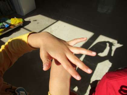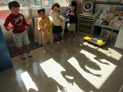 先日、秋の遠足でシルエット観劇に行ってきたことで、さらに影への関心が高まったのか、その時に教えてもらった手でつくる動物をみんなで試していました。