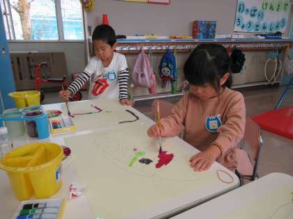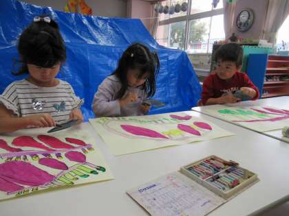 昨日の収穫の喜びを絵に描きました。いつもはクレヨンで描いて絵具で塗って仕上げていましたが、今回はペン書きし、絵具で塗り、コンテで影や土の様子を出し、仕上げていきました。コンテが特に楽しかったようで、本物のサツマイモを見ながらそれに合った色を探して重ね塗りしていました。自分で考えて、試行錯誤しながらしている姿に年長らしさを感じました。