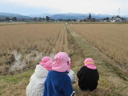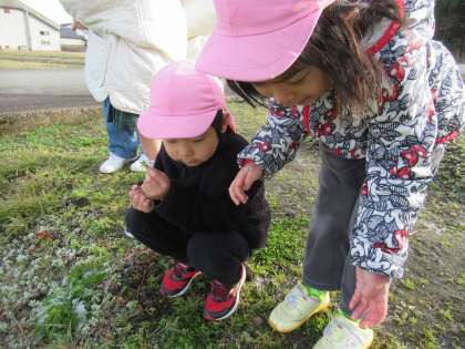 今朝は冷え込んでいたこともあり、田んぼには氷が張り、道端には霜柱、草花にも霜が降り「砂糖がかかったみたいに白いね」「指で触ると冷たいよ」と、それぞれが気付いたことを伝え合っていました。