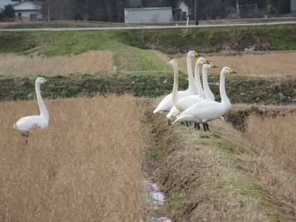 目的地の田んぼに着くと、白鳥が8羽。じっと動かなかったりトコトコと歩き出したりする姿を静かに見守りました。羽を広げると白鳥が大きく見え「バイバイって言ってるのかな」「もうすぐ飛んでいくのかな」と見つめていました。素敵な出会いができました。