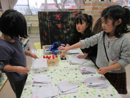 ばら組だけの仕事として、年賀状の配達があります。毎年ばら組がしてきたということもあり、楽しみにしていたようです。集配し、消印を押し、仕分けをして、それぞれの保育室に配達に行きます。「郵便で〜す」と言いながら渡し「ありがとう」と言ってもらえて嬉しそうです。文字への関心も高まってきました。しばらく遊びが続きそうです。