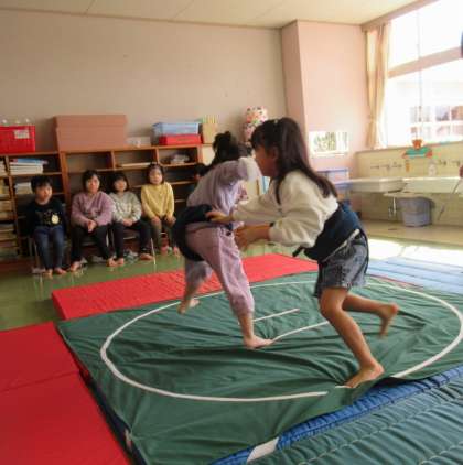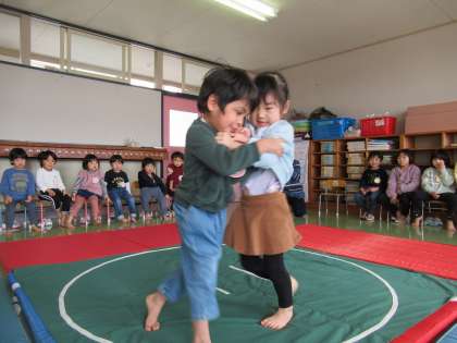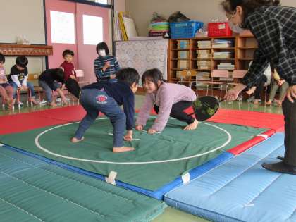 年齢ごとに取組を行いました。「よいしょ!よいしょ!」の掛け声とともに力強く四股を踏み「はっけよい のこった」で相手に立ち向かっていきます。周りの応援にも力が入り、いつもは勝っている子が負けるという番狂わせもありました。大いに盛り上がり、みんなで頑張りを褒め合いました。