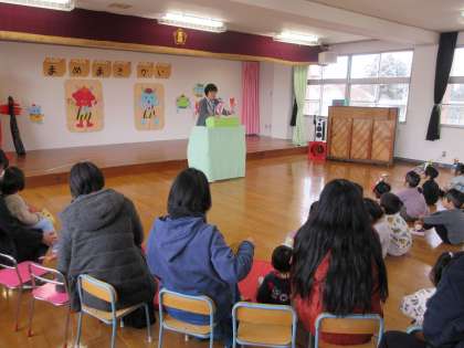 遊戯室での豆まき会では♪豆まき♪の歌を歌ったり、園長先生から節分の由来の話を聞いたりしました。親子サークルの友達も一緒に参加し、子供たちは心の中の鬼を退治しようと元気な声で歌っていましたよ。