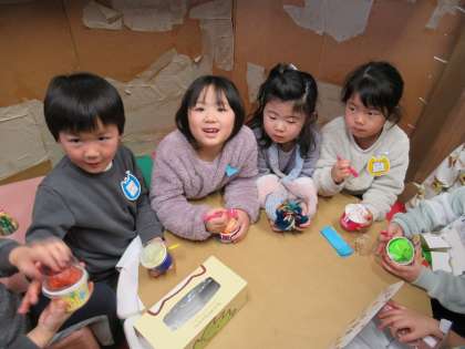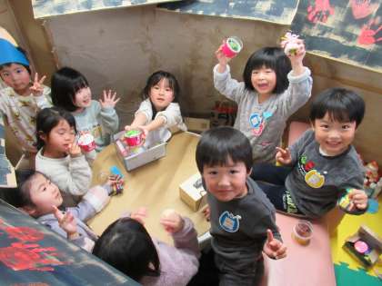 ばら組にある段ボールでつくった家の中で、何やら話し声が聞こえてきます。うさぎ組も一緒に家の中に入り、友達がつくってくれたアイスクリームを食べながら「美味しいね」「次は何して遊ぶ」と相談しています。囲われた空間が心地よく、毛糸で帽子をつくったりマフラーをつくったりもしています。