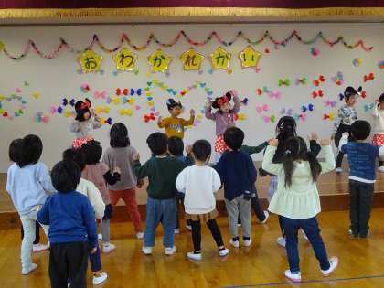 お別れ会(全園児)3 公開日 2024/03/07 更新日 2024/03/07 楽しい月岡幼稚園ニュース プレゼントタイムではうさぎ組からはペン立て、もも組からはハートを広げるとお花になるメッセージカード、首飾りをプレゼントしました。また、ばら組からは「ミッキーマウスマーチ」の踊りのプレゼントやキーホルダーのプレゼント等、互いに思い合い、心を込めたプレゼントに笑みがこぼれました。