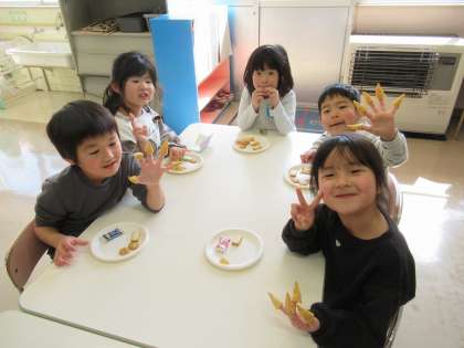 壇の山公園への散歩は、全員で出かけました。久しぶりの公園に伸び伸びと走り回り、どんぐり拾いをし、滑り台を何度も滑っていました。帰ってきてからのおやつパーティーでは「みんなでおやつを食べるのも最後かな」と話しながら、楽しい時間を過ごしました。まだまだ、遊び足りない様子でした。