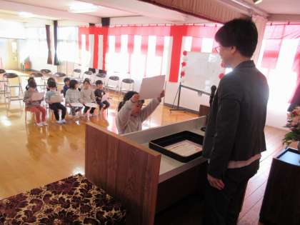 式後は、入園式のアトラクションの練習をしました。進級することや新しいお友達を迎えることを楽しみにしている子供たちです。