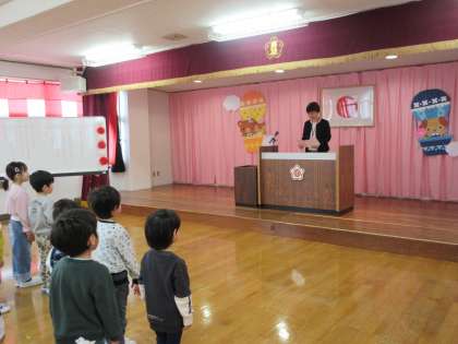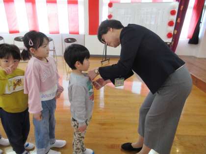 今日から1学期が始まりました。下駄箱や保育室が変わり、少し緊張した様子の友達もいましたが、自分の名前を見つけると笑顔が見られました。 遊戯室で着任式と1学期の始業式がありました。園長先生からピカピカの新しいバッチをもらうと、じーっと眺めて嬉しそうな子供たちでした。入園式の歓迎会では、うさぎ組・ばら組が、それぞれリズムを踊ったりや言葉を言ったりします。久しぶりの練習でしたが、思い出しながら取り組むことができました。新しい友達の入園を楽しみにしている子供たちです。