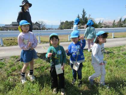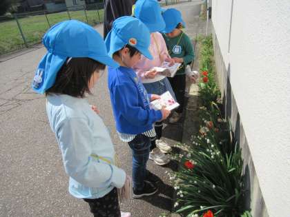 先日は月岡小学校で春見つけをしてきましたが、今日は幼稚園の周りを巡り、春を見つけに行きました。
