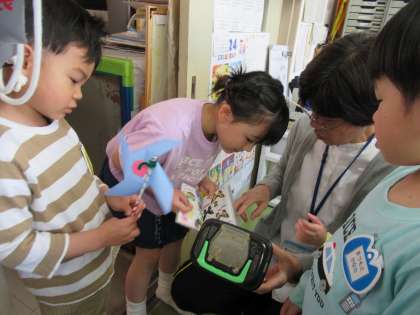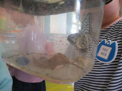 昨日はさなぎだったのに、登園したら飼育ケースの中に蝶が!「さなぎから蝶が出てきた」と大騒ぎになり、すぐに自分の持っている図鑑で調べ、アゲハ蝶であることが判明。園長先生にも知らせました。午後になり「蝶、元気なくなってきてるかな」「逃がしてあげたらいいよね」「でも、ずっと一緒にいたいな」と話し合いをし、逃がすことになりました。空高く飛んでいく蝶を見ながら「また遊びに来てね」と手を振りました。