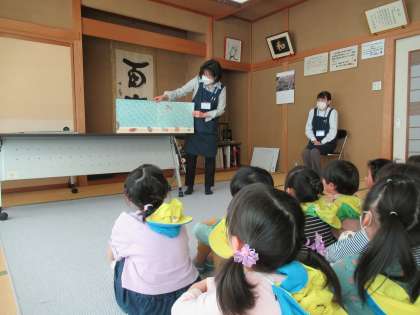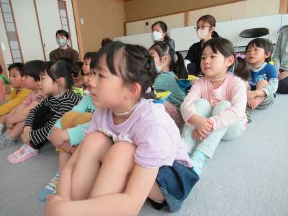 月岡地区センターでいつもお世話になっている図書館の方々が読み聞かせをしてくださいました。全部で5冊。どれも楽しいお話ばかりで、知っている話もあり、楽しそうに見ていました。