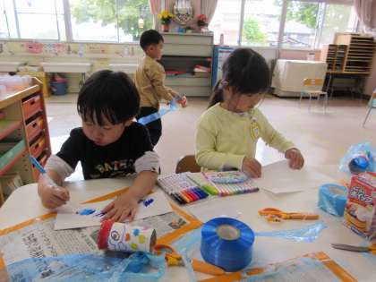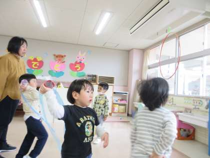 つくったこいのぼりを、部屋や外で飛ばして遊びました。的に向かって飛ばしたり、友達と距離を競ったりする子供たちでした。