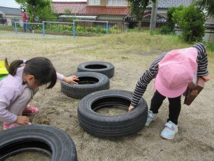 園庭に出ると「ダンゴムシ探そう」と話をするAちゃんとBちゃん。「ここにいるかな?」といろいろな場所を探していると・・・プランターの下にダンゴムシを発見!ダンゴムシ迷路に入れたり、手の平を歩かせたりしてふれ合いました。