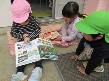「せっかく捕まえたから逃がしたくないね」「ダンゴムシのおうちをつくったらいいんじゃない?」と話をして、おうちをつくることにしました。図鑑を見て、住みやすい環境や食べるものを調べ、素敵なおうちになりました。元気に育つといいですね。