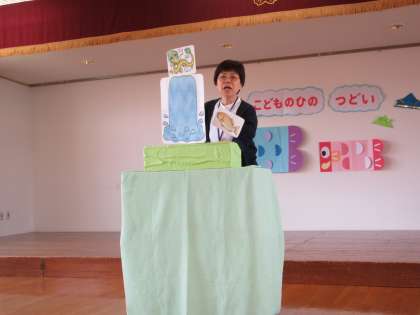 はじめに、園長先生から子どもの日や鯉のぼりの由来をペープサートで教えていただきました。最後まであきらめなかった鯉が滝を上り立派な龍になれたことを知り、あきらめないで頑張ることが大事だと感じた子どもたちでした。
