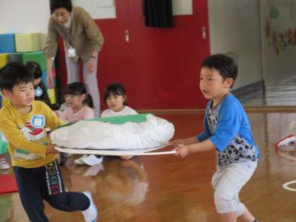 体操やかけっこをした後、2チームに分かれ「柏餅運びレース」と「鯉のぼり玉入れ」をしました。