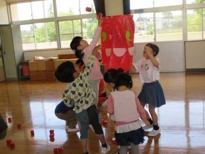 「鯉のぼり玉入れ」では、かごが鯉のぼりになっていて、どれだけ玉が入ったかが互いに見えにくく、一生懸命狙って玉を投げ続けた子どもたちです。もも組もお兄さん、お姉さんの姿を見て真似っこしながら投げていました。皆嬉しそうでしたよ。