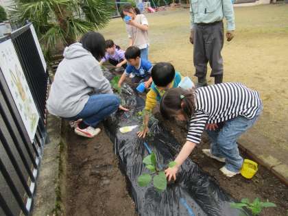 苗の植え方を教えてもらい、畝に開けられた穴に苗を入れ、優しく土をかけていました。