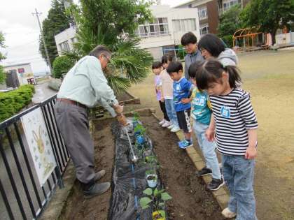 昨年度のばら組が夏野菜を育てていたことを覚えていて、今年度も夏野菜を植えることになりました。一人一苗を育てることにし、自分で植えたい夏野菜も決めました。