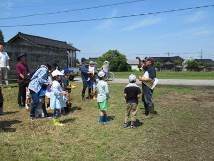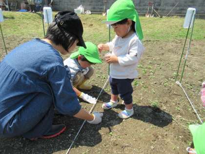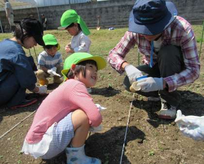 えだまめの種まき 公開日 2024/06/03 更新日 2024/06/03 楽しい月岡幼稚園ニュース 6月1日(土) 月岡校下ふるさとづくり推進協議会主催の「えだまめの種まき」が行われました。 土に穴を開け、2粒ずつ枝豆の種を入れ、優しく土をかけていきます。たくさんの方が参加され、晴天の中汗をかきながら最後まで楽しみました。 9月には収穫祭も予定されています。散歩へ出かける際には、枝豆の生長も見に行きたいと思います。
