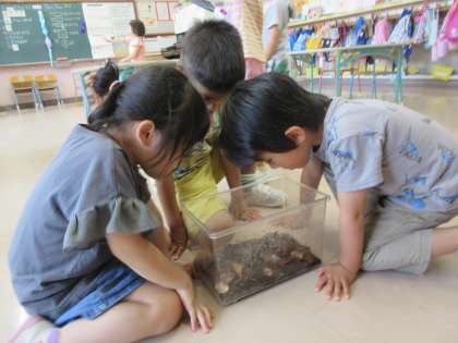 「どの子がお母さんかな?」と見ていると、体の中に赤ちゃんがいるダンゴムシが次々と出てきて…「ここにも赤ちゃんがいる!」「生まれた!」「すごい!」「かわいい」と大騒ぎ。