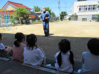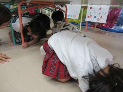子どもたちは、ベルの合図や放送の話を聞いて机の下に入り頭を守る行動をとったり、先生と一緒に園庭へ避難したりすることができました。