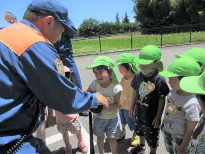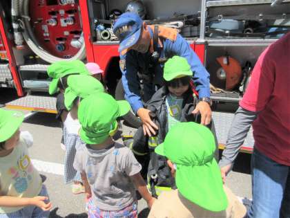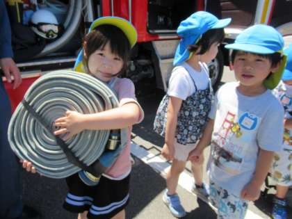 避難訓練(防災訪問)がありました2(全年齢) 公開日 2024/06/19 更新日 2024/06/19 楽しい月岡幼稚園ニュース 避難訓練の後、消防車両の見学をさせていただきました。 放水時に使うホースをもたせてもらったり、ヘルメットや防火服等を着せてもらい「重たいね」「消防士さんってすごい」「服は熱くならないのかな」と話していました。 火遊びをしないことやおうちの人にも火事に気を付けてもらうことを消防士さんと約束しましたので、ぜひお子さんに聞いてみてくださいね。