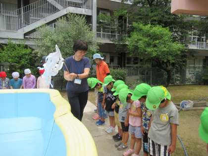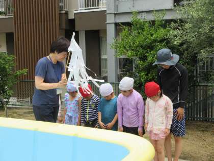 プール開きでは、みんなが怪我なく安全に遊べるようにと、天の神様に夏野菜をお供えし、神様の代わりに園長先生に塩でプールを清めてお祓いをしてもらいました。