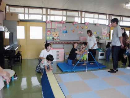 マットや鉄棒等を使ってサーキット遊びをしたり、パパやママと一緒に体ほぐしをしたりしました。