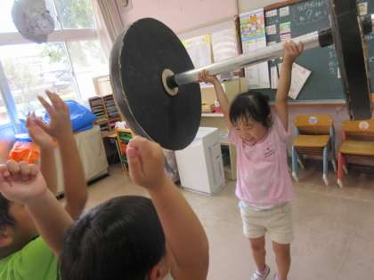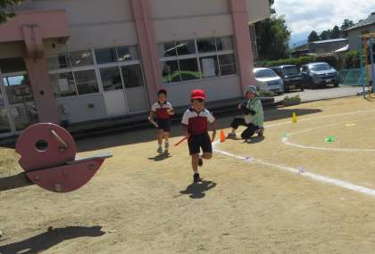 秋晴れの暑いくらいの天気になりました。子ども達は朝から元気に登園し「今日は全部やるんだよ」「楽しみだね」と話をしていました。どの競技にも力いっぱい取り組んでいる子ども達。給食後には、保育室で「宇宙人のやつしたい」と、加技走のボール倒しやダンベル上げで遊んだり、3歳児が4歳児の真似をして広告紙で小旗をつくりリズムを踊ったりする姿が見られました。
