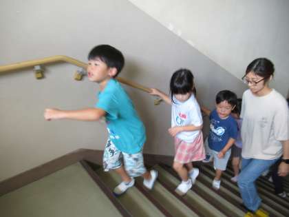 地震から洪水が発生したという災害想定で、月岡小学校の3階まで階段を上って避難しました。