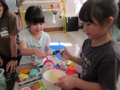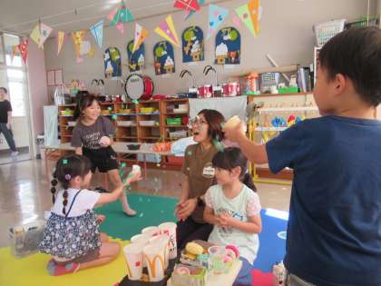今日、誕生日を迎えた友達と昨日誕生日を迎えた先生の誕生日をお祝いしようと自分たちで考え、テーブルやお皿も空き箱を利用してつくり、クラッカーも手づくりしていました。準備が終わり「誕生日の人はお座りください」と招待し、みんなでお祝いしました。とても楽しい誕生会になりました。しばらく誕生会ごっこが続きそうです。