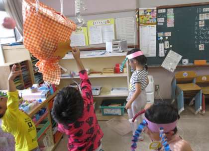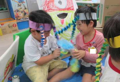 もも・うさぎ組では、様々な遊びのコーナーができ友達や教師を誘って一緒に遊んでいます。宇宙人の家では、宇宙人のお面をつけて「ごはんどうぞ」「一緒にお風呂に入ろう」と言葉のやりとりを楽しんでいます。