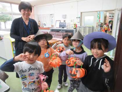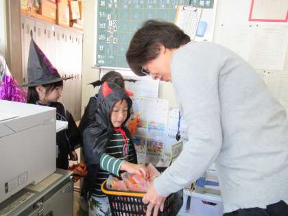 子どもたちはハロウィンの雰囲気を味わいながら、毎日園長先生のところへ行き「トリック オア トリート」と伝えて、お菓子??をもらっていました。