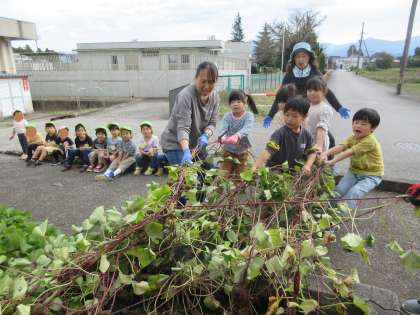はじめに、みんなで力を合わせてサツマイモのつるを引っ張りました。つるの先にイモがついているのを見つけると「あった!」「やったー」と喜ぶ子どもたち。