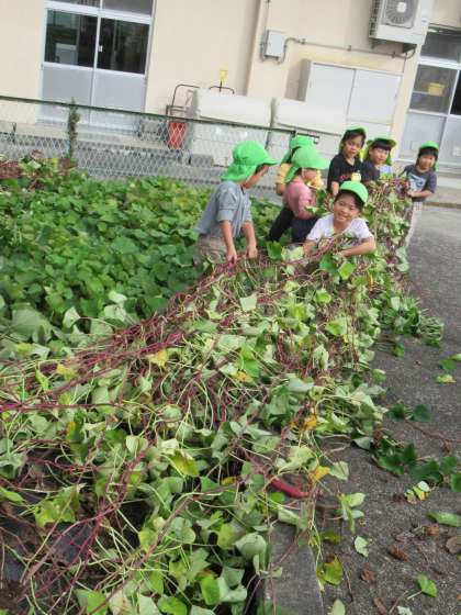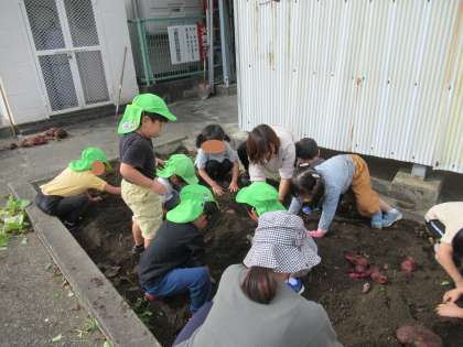 そのあとは土の中に眠っているサツマイモを見つけ、傷つけないようにそーっと掘りました。宝探しのように、夢中になって掘る姿が見られました。