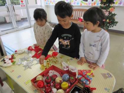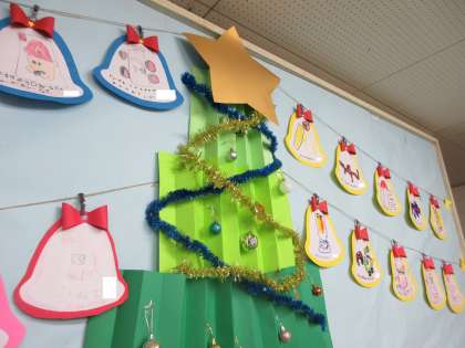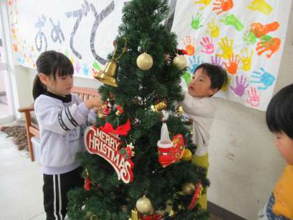 クリスマスに向けて・・・(全年齢) 公開日 2024/11/28 更新日 2024/11/28 楽しい月岡幼稚園ニュース 11月27日(水) 11月も終わりに差し掛かり、子どもたちは「サンタさんまだかな」「恐竜のおもちゃが欲しい」とクリスマスを心待ちにしています。 今日は、クリスマスツリーに飾りつけ♪電飾が灯ると「わぁー!」「きれい」と目をキラキラ輝かせていました。玄関には、一人一人が欲しいおもちゃを絵に描いて飾りました。園内もクリスマスモードです。