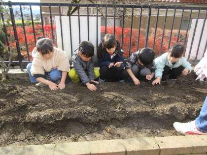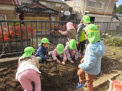 園庭の花壇にチューリップの球根を植えました。「何色の花が咲くかな?」「大きくなあれ」と、話をしながら優しく土のお布団をかぶせてあげました。チューリップの花が咲く頃には、子どもたちもひとつ大きくなります。春が来るのが楽しみですね。