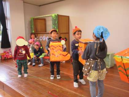 もも・うさぎ組は「違う役もしてみたい!」と子どもたちから声が聞かれ、役を変えて発表会ごっこしました。ほとんどの子が友達のセリフをよく覚えており、上手で驚きました。途中、セリフが分からなくなると「こう言うんだよ」と優しく友達に教える姿も見られました。