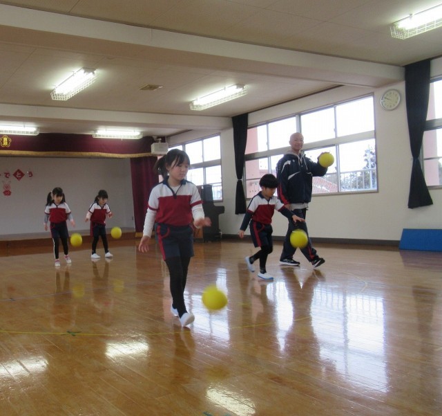 3連休が終わり、今日は体操教室から始まりました。三鍋先生にボールの使い方や遊び方を教えてもらい、ドリブルをしながら前に進んだりボールを上に投げてキャッチするまでに何回手を叩けるのかに挑戦したりしました。「上手いね」と褒めてもらって、得意気に笑っていました。