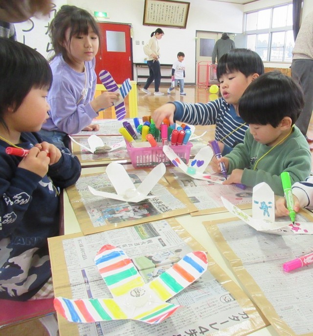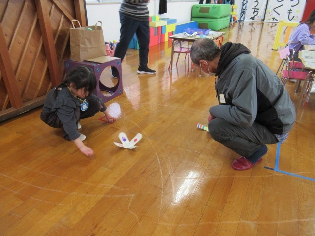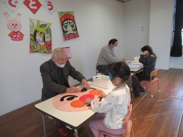子どもたちも福寿会のおじいちゃん方とふれ合い、こまの回し方を教えてもらったり、福笑いで褒められたりしたことがうれしかったようです。福笑いやこま回し、けん玉や羽子板等、正月ならではの経験を大切にしていきたいと思っています。