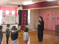 英語教室参観(全園児) 公開日 2025/01/20 更新日 2025/01/20 楽しい月岡幼稚園ニュース 1月20日(月)毎月実施している英語教室ですが、今日は、保護者の方々に参観していただきました。いつもの通り、はじめは5歳児、つぎに3・4歳児でしたが、子どもたちは、おうちの方がおられることで、うれしいやら恥ずかしいやら・・・。緊張していつもより声が出ない子もいました。保護者の皆様、今日はありがとうございました。 楽しい月岡幼稚園ニュース