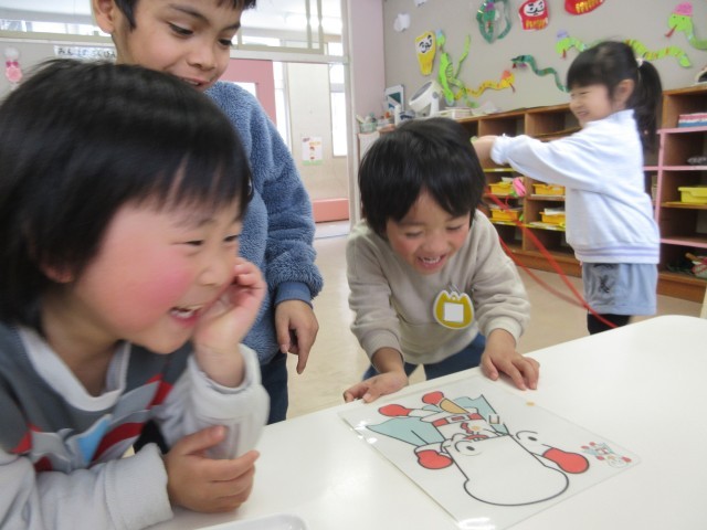 もも組とうさぎ組の子どもたちは、かるたやコマ、福笑い、お手玉などいろいろなお正月遊びを楽しんでいます。友達と競うことも楽しいですが、福笑いで変な顔になって顔を見合わせて笑うのも楽しい様子です。