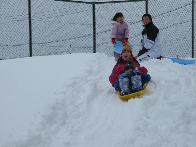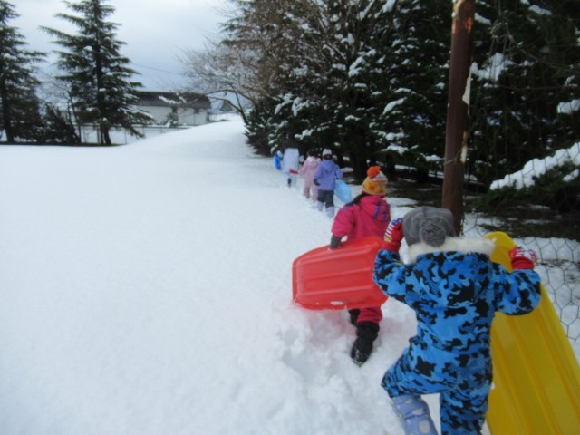雪が深く積もり、道なき道を歩きながら倒れそうになる子どもたち。それでも力強く進み築山に着くと、すぐに山の頂上に上りました。圧雪していないために最初はそりも滑らず、交代しながら何度も滑って道をつくりました。勢いが出てくるとスピードが速くなり、滑る距離を友達と競っていました。2人乗りも楽しみました。